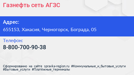 Газнефть, сеть АГЗС по адресу 655153, Хакасия, Черногорск, Бограда, 05 в дальнейшем Организация, размещена в следующих категориях: