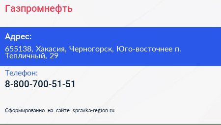 Газпромнефть по адресу 655138, Хакасия, Черногорск, Юго-восточнее п. Тепличный, 29 в дальнейшем Организация, размещена в следующих категориях: