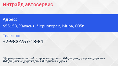 Интрэйд, автосервис по адресу 655153, Хакасия, Черногорск, Мира, 005г в дальнейшем Организация, размещена в следующих категориях: