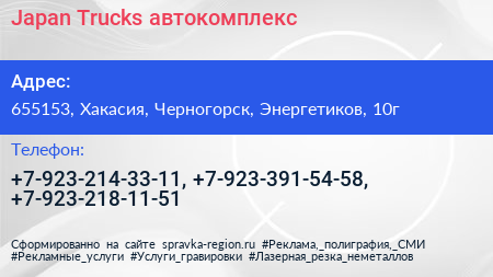 Japan-Trucks, автокомплекс по адресу 655153, Хакасия, Черногорск, Энергетиков, 10г в дальнейшем Организация, размещена в следующих категориях: