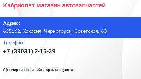 Кабриолет, магазин автозапчастей по адресу 655162, Хакасия, Черногорск, Советская, 60 в дальнейшем Организация, размещена в следующих категориях: