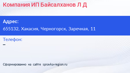 Компания, ИП Байсалханов Л.Д. по адресу 655132, Хакасия, Черногорск, Заречная, 11 в дальнейшем Организация, размещена в следующих категориях:
