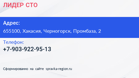 ЛИДЕР, СТО по адресу 655100, Хакасия, Черногорск, Промбаза, 2 в дальнейшем Организация, размещена в следующих категориях: