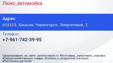 Люкс, автомойка по адресу 655153, Хакасия, Черногорск, Энергетиков, 1 в дальнейшем Организация, размещена в следующих категориях: