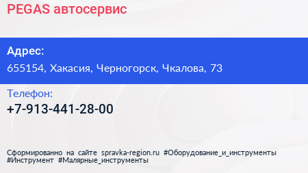 PEGAS, автосервис по адресу 655154, Хакасия, Черногорск, Чкалова, 73 в дальнейшем Организация, размещена в следующих категориях: