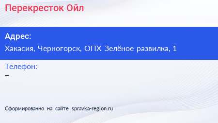 Перекресток Ойл по адресу Хакасия, Черногорск, ОПХ Зелёное развилка, 1 в дальнейшем Организация, размещена в следующих категориях: