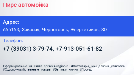 Пирс, автомойка по адресу 655153, Хакасия, Черногорск, Энергетиков, 30 в дальнейшем Организация, размещена в следующих категориях: