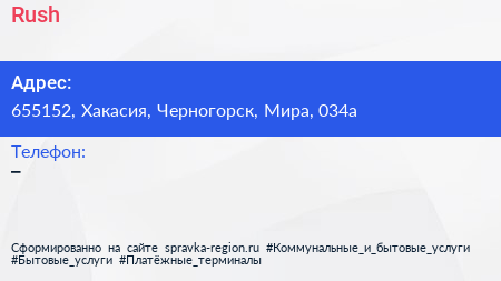Rush по адресу 655152, Хакасия, Черногорск, Мира, 034а в дальнейшем Организация, размещена в следующих категориях: