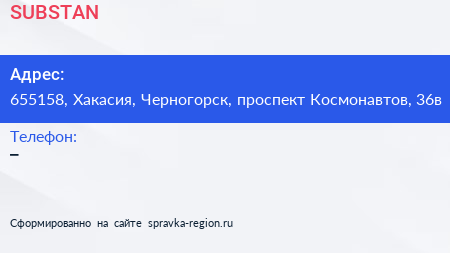 SUBSTAN по адресу 655158, Хакасия, Черногорск, проспект Космонавтов, 36в в дальнейшем Организация, размещена в следующих категориях: