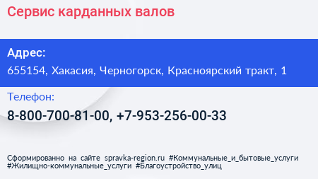 Сервис карданных валов по адресу 655154, Хакасия, Черногорск, Красноярский тракт, 1 в дальнейшем Организация, размещена в следующих категориях:
