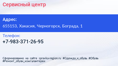 Сервисный центр по адресу 655153, Хакасия, Черногорск, Бограда, 1 в дальнейшем Организация, размещена в следующих категориях: