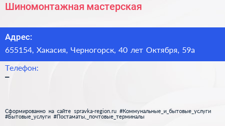 Шиномонтажная мастерская по адресу 655154, Хакасия, Черногорск, 40 лет Октября, 59а в дальнейшем Организация, размещена в следующих категориях: