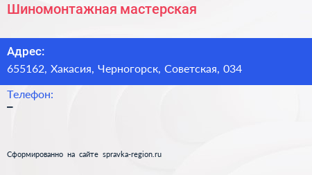 Шиномонтажная мастерская по адресу 655162, Хакасия, Черногорск, Советская, 034 в дальнейшем Организация, размещена в следующих категориях: