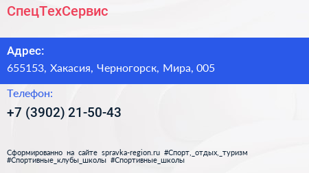 СпецТехСервис по адресу 655153, Хакасия, Черногорск, Мира, 005 в дальнейшем Организация, размещена в следующих категориях: