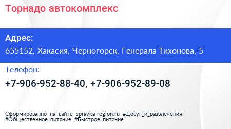 Торнадо, автокомплекс по адресу 655152, Хакасия, Черногорск, Генерала Тихонова, 5 в дальнейшем Организация, размещена в следующих категориях:
