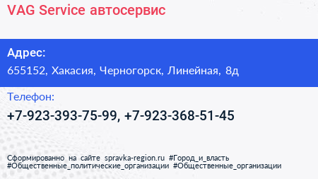 VAG Service, автосервис по адресу 655152, Хакасия, Черногорск, Линейная, 8д в дальнейшем Организация, размещена в следующих категориях: