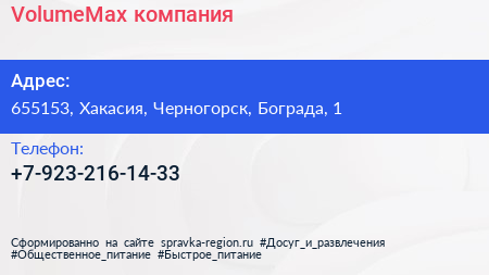 VolumeMax, компания по адресу 655153, Хакасия, Черногорск, Бограда, 1 в дальнейшем Организация, размещена в следующих категориях: