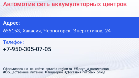 Автомотив, сеть аккумуляторных центров по адресу 655153, Хакасия, Черногорск, Энергетиков, 24 в дальнейшем Организация, размещена в следующих категориях: