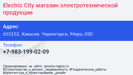 Electric City, магазин электротехнической продукции по адресу 655152, Хакасия, Черногорск, Мира, 030 в дальнейшем Организация, размещена в следующих категориях: