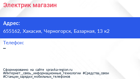 Электрик, магазин по адресу 655162, Хакасия, Черногорск, Базарная, 13 к2 в дальнейшем Организация, размещена в следующих категориях: