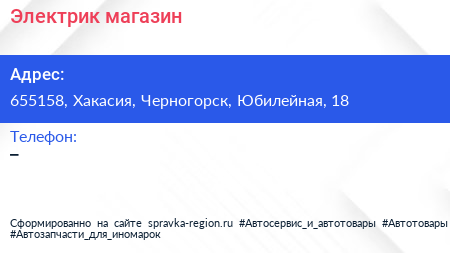 Электрик, магазин по адресу 655158, Хакасия, Черногорск, Юбилейная, 18 в дальнейшем Организация, размещена в следующих категориях: