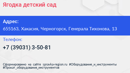 Ягодка, детский сад по адресу 655163, Хакасия, Черногорск, Генерала Тихонова, 13 в дальнейшем Организация, размещена в следующих категориях: