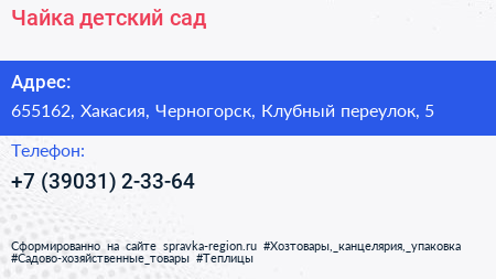 Чайка, детский сад по адресу 655162, Хакасия, Черногорск, Клубный переулок, 5 в дальнейшем Организация, размещена в следующих категориях: