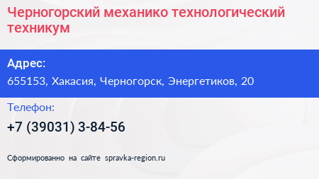 Черногорский механико-технологический техникум по адресу 655153, Хакасия, Черногорск, Энергетиков, 20 в дальнейшем Организация, размещена в следующих категориях: