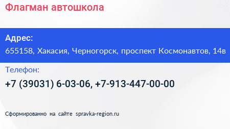 Флагман, автошкола по адресу 655158, Хакасия, Черногорск, проспект Космонавтов, 14в в дальнейшем Организация, размещена в следующих категориях: