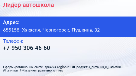 Лидер, автошкола по адресу 655158, Хакасия, Черногорск, Пушкина, 32 в дальнейшем Организация, размещена в следующих категориях: