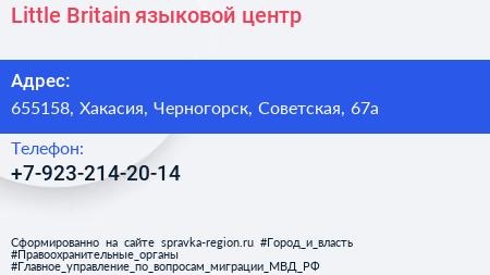 Little Britain, языковой центр по адресу 655158, Хакасия, Черногорск, Советская, 67а в дальнейшем Организация, размещена в следующих категориях: