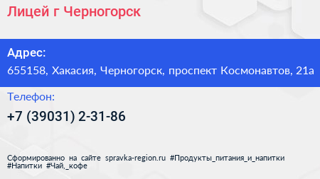 Лицей, г. Черногорск по адресу 655158, Хакасия, Черногорск, проспект Космонавтов, 21а в дальнейшем Организация, размещена в следующих категориях: