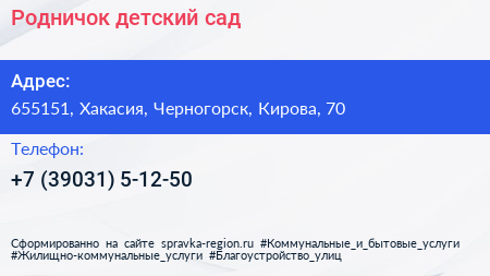 Родничок, детский сад по адресу 655151, Хакасия, Черногорск, Кирова, 70 в дальнейшем Организация, размещена в следующих категориях: