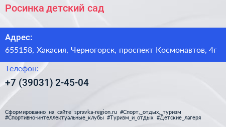 Росинка, детский сад по адресу 655158, Хакасия, Черногорск, проспект Космонавтов, 4г в дальнейшем Организация, размещена в следующих категориях: