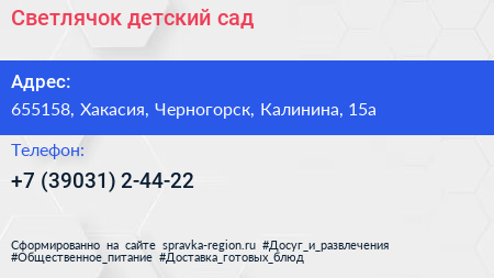 Светлячок, детский сад по адресу 655158, Хакасия, Черногорск, Калинина, 15а в дальнейшем Организация, размещена в следующих категориях: