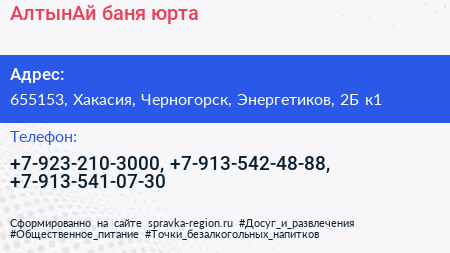 АлтынАй, баня-юрта по адресу 655153, Хакасия, Черногорск, Энергетиков, 2Б к1 в дальнейшем Организация, размещена в следующих категориях:
