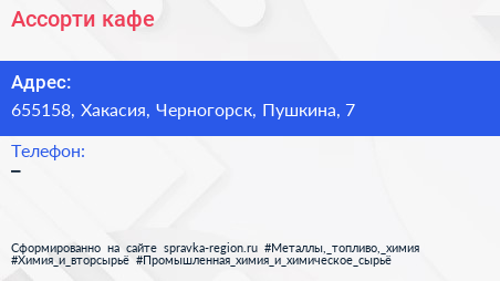 Ассорти, кафе по адресу 655158, Хакасия, Черногорск, Пушкина, 7 в дальнейшем Организация, размещена в следующих категориях:
