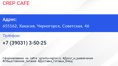 CREP CAFE по адресу 655162, Хакасия, Черногорск, Советская, 46 в дальнейшем Организация, размещена в следующих категориях: