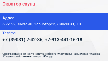 Экватор, сауна по адресу 655152, Хакасия, Черногорск, Линейная, 10 в дальнейшем Организация, размещена в следующих категориях: