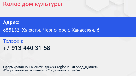 Колос, дом культуры по адресу 655132, Хакасия, Черногорск, Хакасская, 6 в дальнейшем Организация, размещена в следующих категориях: