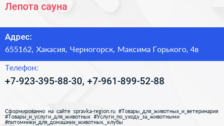 Лепота, сауна по адресу 655162, Хакасия, Черногорск, Максима Горького, 4в в дальнейшем Организация, размещена в следующих категориях: