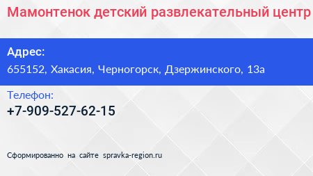 Мамонтенок, детский развлекательный центр по адресу 655152, Хакасия, Черногорск, Дзержинского, 13а в дальнейшем Организация, размещена в следующих категориях: