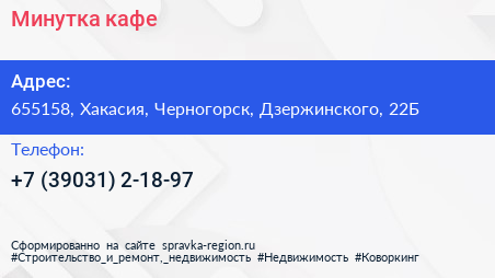 Минутка, кафе по адресу 655158, Хакасия, Черногорск, Дзержинского, 22Б в дальнейшем Организация, размещена в следующих категориях: