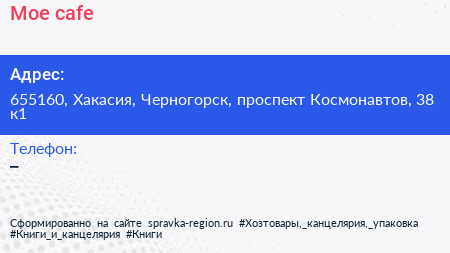 Мое cafe по адресу 655160, Хакасия, Черногорск, проспект Космонавтов, 38 к1 в дальнейшем Организация, размещена в следующих категориях: