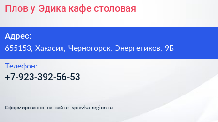 Плов у Эдика, кафе-столовая по адресу 655153, Хакасия, Черногорск, Энергетиков, 9Б в дальнейшем Организация, размещена в следующих категориях: