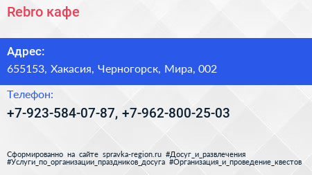 Rebro, кафе по адресу 655153, Хакасия, Черногорск, Мира, 002 в дальнейшем Организация, размещена в следующих категориях: