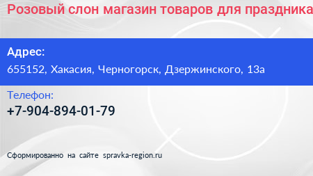 Розовый слон, магазин товаров для праздника по адресу 655152, Хакасия, Черногорск, Дзержинского, 13а в дальнейшем Организация, размещена в следующих категориях: