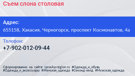 Съем слона, столовая по адресу 655158, Хакасия, Черногорск, проспект Космонавтов, 4а в дальнейшем Организация, размещена в следующих категориях: