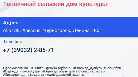 Тепличный, сельский дом культуры по адресу 655138, Хакасия, Черногорск, Ленина, 40а в дальнейшем Организация, размещена в следующих категориях: