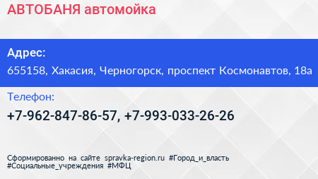 АВТОБАНЯ, автомойка по адресу 655158, Хакасия, Черногорск, проспект Космонавтов, 18а в дальнейшем Организация, размещена в следующих категориях: